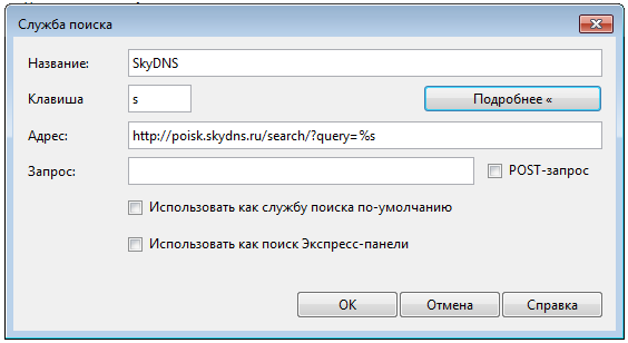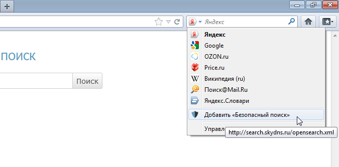В поле «Адрес» скопируйте строку http://poisk.skydns.ru/search/?query=%s