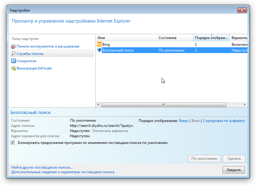 Поисковую систему необходимо сделать работающей по умолчанию, включив обе галочки для «Использовать по умолчанию» и «Использовать в экспресс-панели».